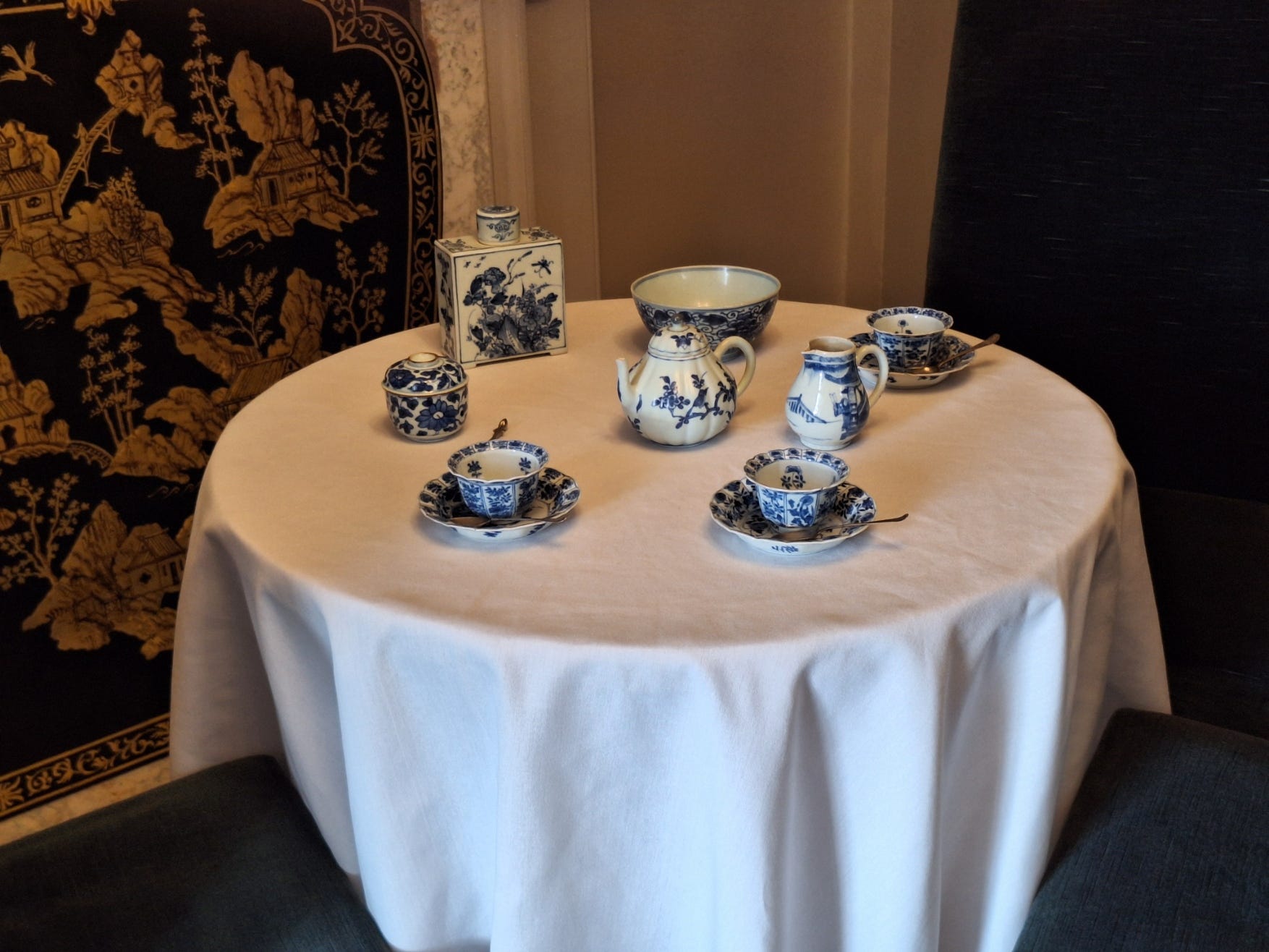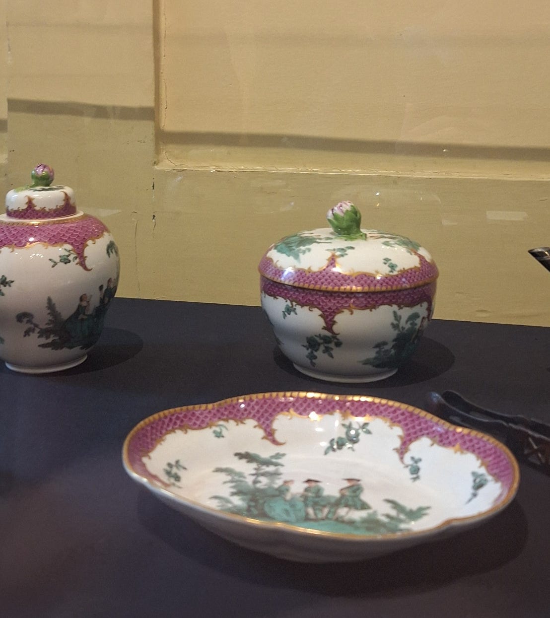 Both include a porcelain tea caddy (called a tea canister at the time). These containers were the way that tea was stored in China and the design followed the tea to England before being replaced by the wooden lockable tea boxes in the course of the 18th century. At Marble Hill, we tell people that the tea was probably kept in a locked box and the china tea cylinder is essentially decorative, but the fact that the later Meissen set includes a tea cylinder suggests that tea was still served from such containers well into the 18 century.