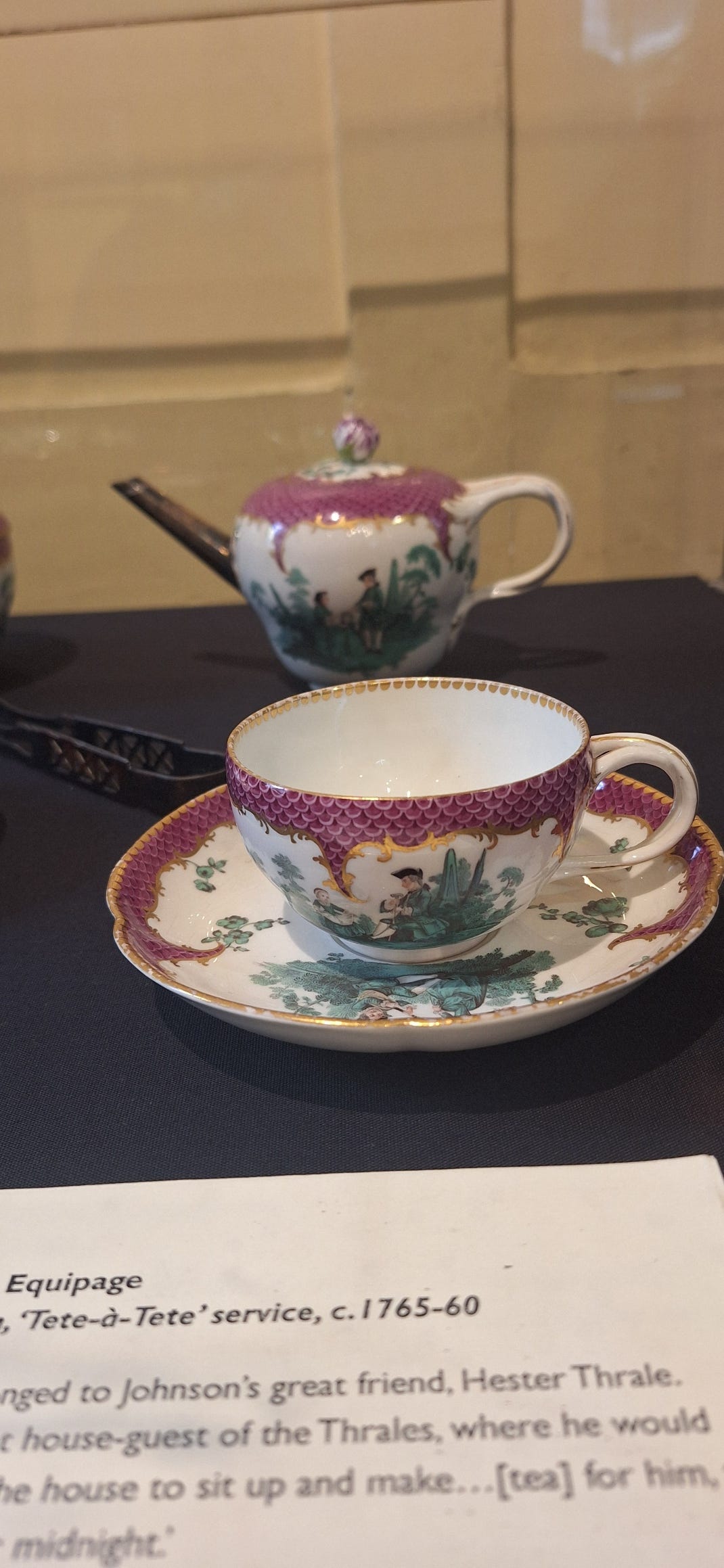 Henrietta had been a leading lady in the court and, even after she had left, she would have been very conscious of maintaining high social standards at home. She was also a very enthusiastic collector of chinaware that had actually been shipped over from China. Chinese stuff was very fashionable and she had a lot of it. (She even had an extension built to house her China collection — now gone, like the collection it held.) The porcelain on the table is Chinese. It wasn’t until 1710 that at Meissen, near Dresden, Europeans managed to produce an equivalent quality of porcelain. Meissen chinaware was still an expensive import. In Dr Johnson’s house, you can see a similar tea set of Meissen porcelain (below).