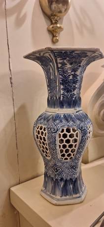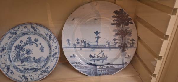 The Dutch were the first European country to reproduce the brilliant white glaze of chinaware by covering their pottery (usually reddish earthenware) with a lead glaze to which has been added tin oxide. Delft was a major centre for the production of the finest Dutch pottery which became known as Delftware. It became very popular and there is a lot of it on display at Marble Hill House where it is, at first glance, easily confused with chinaware.