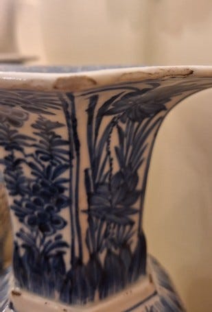Not that the presence of European architecture is definitive, as the Chinese did produce European scenes on some Chinaware intended for the export market. It can be particularly difficult to distinguish Chinese production from Delftware because, as the European market became more important to the Chinese, they produced pottery that looked like Delftware alongside chinaware. The items shown below (all from the V&A in London) were made in China for the export market. The coffee pot (5) imitates a Dutch coffee pot while the figure of a Dutchman (7), although made in China, was decorated in the Dutch Republic.